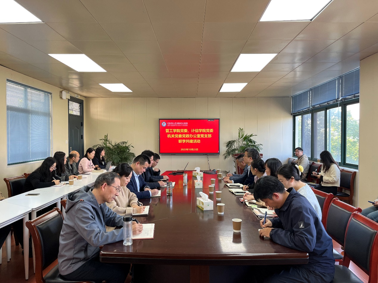 10月23日下午,党政办公室党支部联合管理科学与工程学院党委、计算机与信息工程学院党委在广学楼303会议室开展联学共建活动。本次活动以“强化协同联动,提升履职效能”为主题,通过业务培训和交流研讨相结合的方式,搭建跨部门学习交流平台,推动党建工作与业务工作深度融合。
